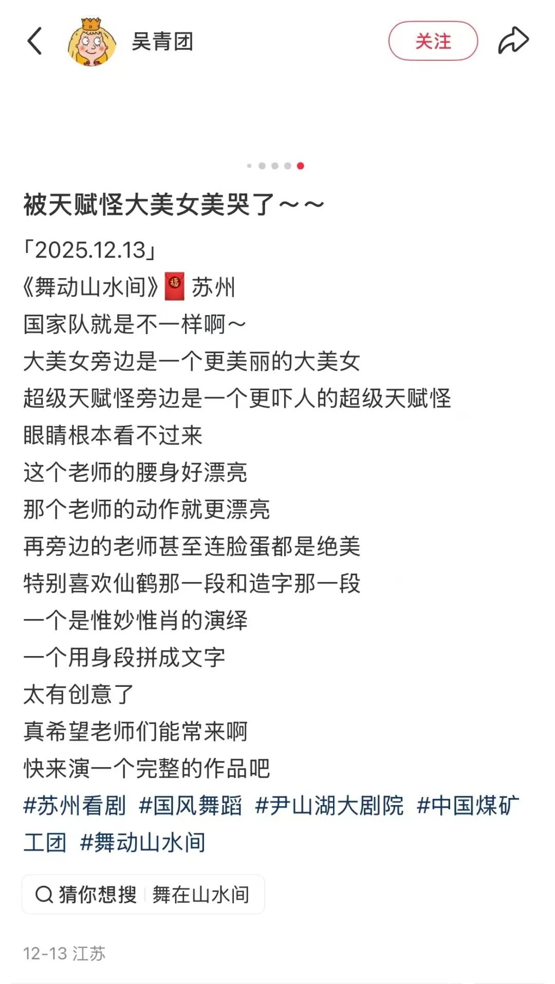 2025年12月9-19日,中國煤礦文工團《舞動山水間》舞蹈專場圓滿完成赴內蒙古自治區興安盟、福建南平、江蘇蘇州、浙江嘉興、陜西安康、四川簡陽6城7場的全國巡演。