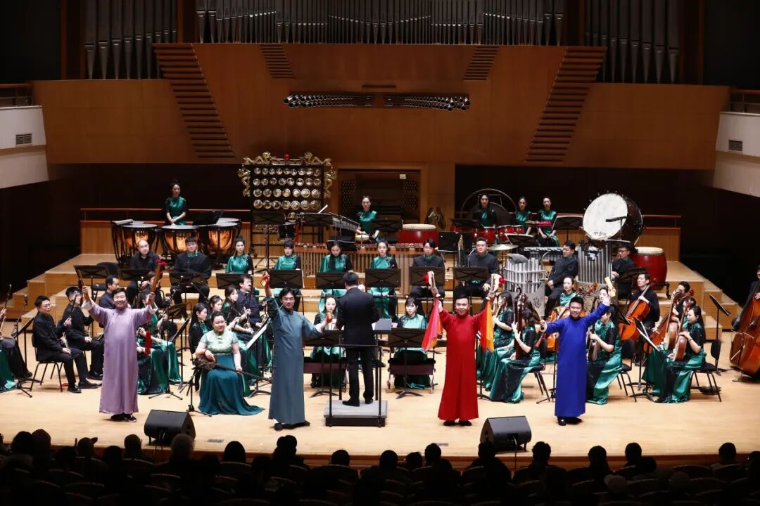 作為“古城新韻”系列音樂會(huì)的延續(xù)之作,《樂萃京城》以北京城古今變遷為敘事脈絡(luò),創(chuàng)新融合了傳統(tǒng)民樂、曲藝以及聲樂等多元藝術(shù)形式,用極具沉浸式的聽覺效果向觀眾娓娓道來老北京城的悠悠歲月。序曲《燕京破曉》拉開晨曦中的古城序幕;笙獨(dú)奏《流年陌巷》勾勒的胡同煙火;京胡與三弦對(duì)話的《中軸里的味道》展現(xiàn)古今變遷,每一首作品都各具韻味。特別是融合三弦、滑稽大鼓與快板的《宛平城》,以新穎的曲藝敘事與管弦樂結(jié)合,盡顯地道的老北京風(fēng)情;笛子名家唐俊喬演繹的《什剎海》,用清澈笛聲描摹水系靈動(dòng);壓軸之作《北京新貌》大膽融入說唱與女聲演唱來表達(dá)新時(shí)代北京的蓬勃活力,每一曲終了都引發(fā)全場熱烈掌聲。