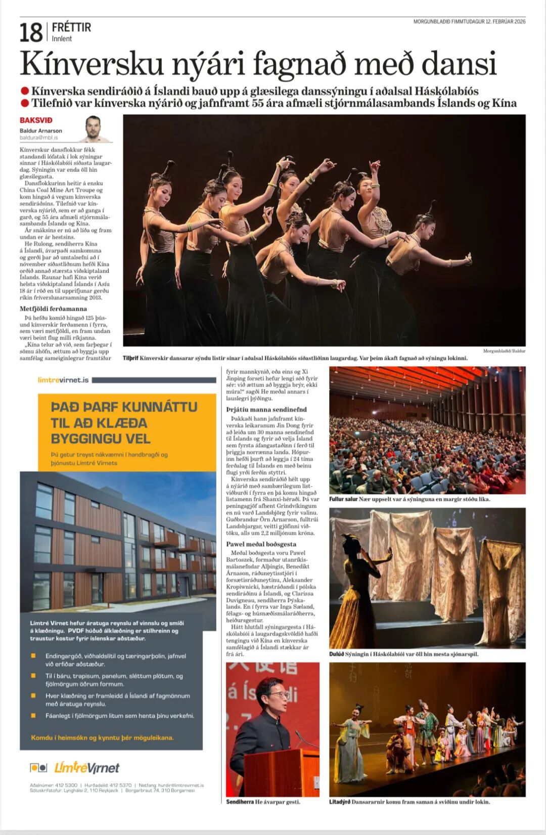 挪威站演出前,中國煤礦文工團團長靳東發表致辭,向現場外賓及華人華僑致以誠摯問候,送上新春吉祥祝福。靳東表示,挪威的自然與人文底蘊,與中華“天人合一”的哲學、“氣韻生動”的藝術追求同頻共振。中國古典舞承載著中華民族五千多年文明基因,是連接兩國文明的絕佳載體。他介紹,本次演出以“歡樂春節”為引,精選多部融合新春意趣與中華文脈的作品,既展現古人納福盛景、大唐絲路氣象,也詮釋醫者仁心、民族氣節,彰顯中華文化的和諧、深邃與包容。中國煤礦文工團肩負文化交流使命,愿以舞為橋、以舞為媒、以舞為禮,深化中挪文化和旅游深度交融,共同發展。當地時間2月12日,靳東帶隊赴挪威舞蹈劇場(Dansens Hus)開展深度交流,圍繞舞蹈創作理念、跨文化巡演經驗、古典舞與現代舞的融合發展等話題深入探討,進一步拓寬了舞蹈藝術交流的廣度與深度。