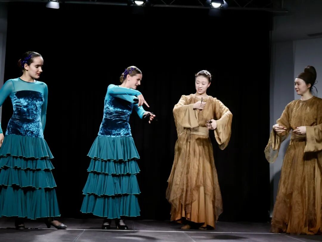 在繁忙的演出之余,一場中西藝術家文化交流聯歡會,于2月28日晚上在拉斯羅薩斯市政府文化中心溫馨開啟,中西節目的交替上演不斷擦出火花。演奏員宋洋以笙奏響充滿西班牙風情的《西班牙斗牛曲》,高亢的音色瞬間點燃全場;二胡齊奏《奔騰》則如疾風驟雨,展現了震撼人心的藝術魅力。西班牙當地藝術學院的學生們則帶來了原汁原味的弗拉門戈舞蹈,踢踏聲如同密集的鼓點,在地板上激蕩出澎湃的力量。動人的一幕發生在藝術家的即興互動中。西班牙學生安蒂婭現場教中國藝術家打西班牙特色“響板”,指尖的節奏讓現場充滿了歡聲笑語,而中國舞蹈演員譚佳迪與齊婧妍則向西班牙姑娘教授《陶姝俑》中的靈動身段?!斑@種多元文化的碰撞太奇妙了!”安蒂婭在互動后興奮地表示,“今天近距離感受到了完全不一樣的中華文化魅力?!?/span>