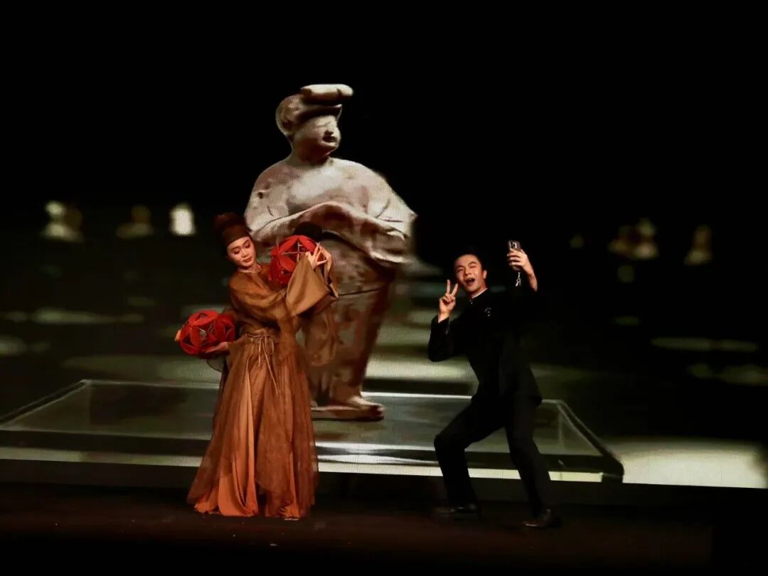第二篇章“鑄魂”,通過青年演員方書劍的視角,串聯起從盛唐陶俑到敦煌石窟的文化長卷。當方書劍深情唱響《故鄉的云》,清澈嘹亮的歌聲穿透劇場,撥動臺下僑胞的心弦。隨后,琵琶與手鼓奏出《送我一朵玫瑰花》,表達了對愛情與浪漫的歌頌和向往?,F場觀演的留學生小劉感慨道:“青年演員的講述式表演極具代入感,讓我們在光影與旋律中讀懂了文化之厚重,這種文化自信讓我們在異國他鄉倍感自豪。”
